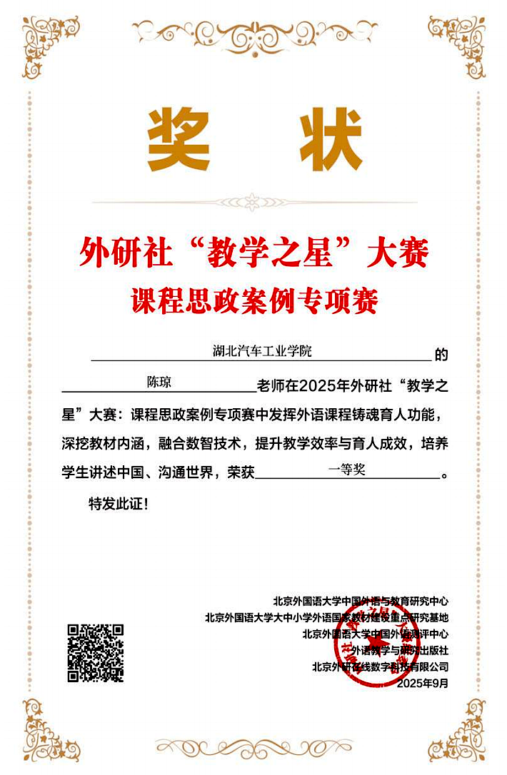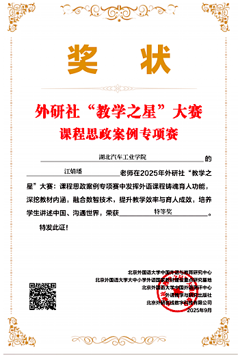 本网讯(文/江靖璠、陈琼)9月10日,2025年外研社“教学之星”大赛课程思政案例专项赛主赛道获奖名单公布。437必赢会员中心教师凭借卓越的教学设计、深厚的思政底蕴与创新理念,在众多参赛者中脱颖而出,智能网联汽车学院教师江婧璠荣获主赛道特等奖;外语外贸学院陈琼老师荣获全国一等奖、刘园丽老师荣获全国二等奖、全莎沙和曹小琳老师荣获全国三等奖。